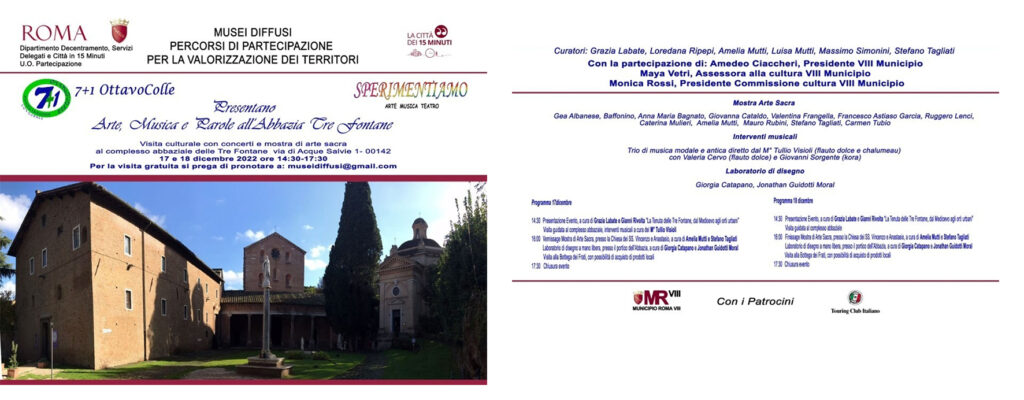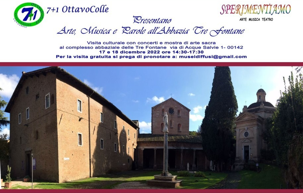 Così in ottavo municipio le associazioni 7più1 Ottavo colle e Sperimentiamo, arte musica, teatro presentano l’evento per sabato 17 e domenica 18: Arte, Musica e Parole all’abbazia delle Tre Fontane.