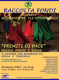 Noi, Associazione 7più1 Ottavocolle, nel nostro piccolo, con il patrocinio del nostro ottavo Municipio, la collaborazione di Don Alfio, parroco di S. Vigilio che ci ospita nel suo bel teatro, il contributo generoso e volontario di artisti ed artiste, attrici e cantanti, come la consigliera dell’ottavo municipio Eleonora Talli Giottoli, il contributo fattivo di Monica Rossi presidente della commissione cultura e di Maya Vetri, assessore alla cultura dedichiamo il 28 marzo una serata di spettacolo, aperto a tutta la cittadinanza dell’Ottavo Colle, per una raccolta fondi per i bambini siriani e turchi vittime due volte, di guerre assurde e di violenti e devastanti sismi.