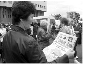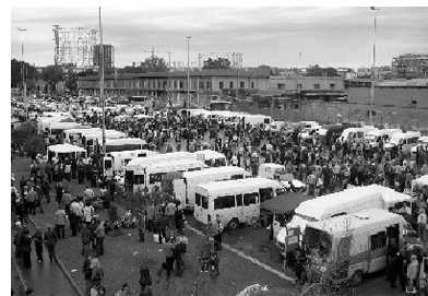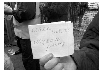 Abbiamo camminato tra questa folla di donne di quasi tutte le età; alcune leggevano tutto d’un fiato i giornali del loro paese, mentre molte altre, schierate su due file, esibivano fogli rabberciati sui quali era scritto, in italiano ed in cirillico: Cerco lavoro o Cerco lavoro ad ore ho esperienza o ancora Cerco lavoro badante telefono 328… Tutte, sia le giovani sia quelle più avanti nell’età, mostravano un sorriso tenero e sincero, anche se generato dal bisogno. Avvertiamo qualcosa, che è più di una spontanea solidarietà, quando assistiamo al colloquio fra una donna e l’autista di uno dei tanti furgoni preposti al trasporto dei pacchi destinati ad ogni angolo dell’Ucraina, alle famiglie di queste donne. Pacchi su pacchi che emanano l’amore ed in alcuni casi lo struggimento con cui vengono preparati ed inviati. Abbiamo anche voluto trattenerci di fronte ad un gruppo di donne e uomini che banchettavano; ci è piaciuto rubare un po’ dell’allegria genuina con la quale avevano solidamente ricostruito il loro paese in due metri quadri.