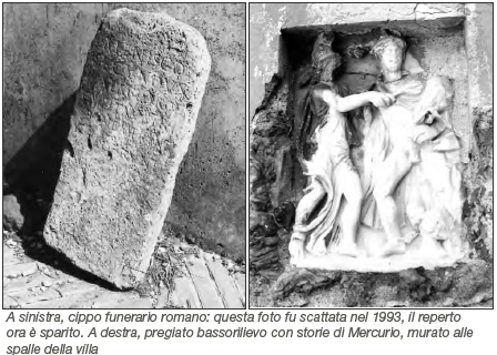 I Sergardi, si legge ancora nella scheda redatta dal Comune, per ragioni di difesa fecero anche costruire sotto il parco, che si trova alle spalle dell’edificio, dei cunicoli che riportarono alla luce i resti di una villa romana del I secolo d.C. Lo scavo restituì diversi marmi lavorati che, insieme ad altri raccolti in zona, furono posti ad ornamento della villa e del parco. Oggi è rimasto solo un pregevole bassorilievo rappresentante storie di Mercurio, murato sul retro della villa, mentre tutti gli altri reperti, tranne alcuni che erano stati trasferiti a Siena dagli antichi proprietari, sono “spariti”. Noi stessi fotografammo nel 1991 un cippo funerario oggi scomparso.
