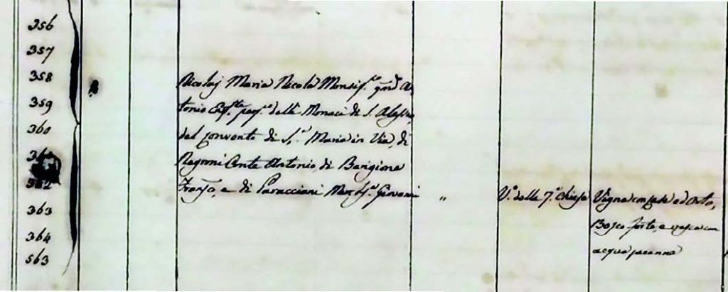 Il registro catastale (vedi figura 2) riporta che, per gli appezzamenti che vanno dal 356 al 365 (incluso quindi il 358) il possidente è Nicolaj Maria Nicolai Monsig. qdam (qdam è la contrazione di “quondam”, locuzione latina usata davanti al nome di un defunto di cui si menziona il figlio, come l’italiano “fu”) Antonio enfiteuta perpetuo delli monaci di S. Alessio, del convento di S. Maria in Via, di Negroni Conte Antonio, di Barigione Francesco e di Paracciani Mon di S. Giovanni; il vocabolo è Via delle Sette Chiese, mentre il possedimento è composto da Vigna con Casa e Orto, Bosco Forte e Vasca con Acqua Piovana.