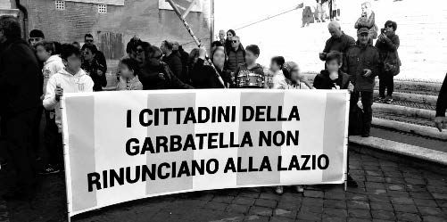 Un bandierone della Lazio, striscioni biancocelesti e magliette stampate per l’occasione non lasciavano dubbi ai passanti curiosi, che affollavano, come ogni fine settimana, la storica piazza. “ I cittadini della Garbatella non rinunciano alla Lazio””L’offerta economica al rialzo, capacità di gestione al ribasso”” La S.S. Lazio Nuoto non si tocca”.