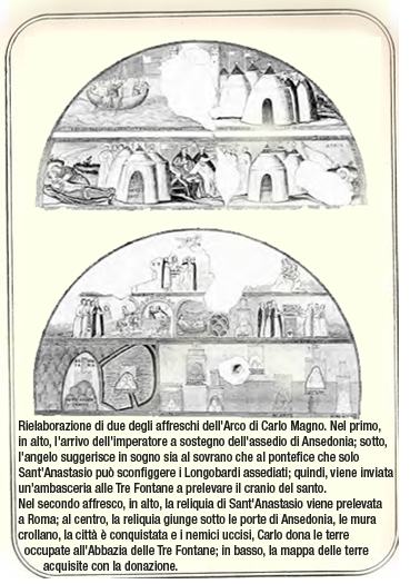 La donazione dell’Argentario all’Abbazia: un falso storico raccontato in un affresco. Il re e il papa assediavano i Longobardi in Ansedonia. La vittoria ottenuta grazie a una reliquia di Sant’Anastasio portata dalle Tre Fontane. Il lascito “per grazia ricevuta”!