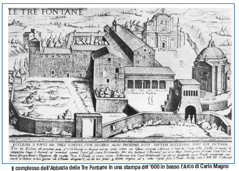 La fama della splendida Abbazia delle Tre Fontane nasce dalla tradizione secondo la quale ivi sarebbe stato martirizzato San Paolo: decapitato, la testa staccata dell’Apostolo sarebbe rimbalzata in terra tre volte, creando tre piccole fonti. Di qui il nome della località. Era quello, dunque, un sito molto venerato dai primi cristiani. In epoche diverse, a partire dal 6° secolo, vi furono costruite e ricostruite tre chiese: SS. Vincenzo e Anastasio, S. Maria Scala Coeli e S. Paolo della decapitazione. Si accede al complesso attraverso una porta monumentale, probabilmente l’edificio più antico del luogo, detto Arco di Carlo Magno per via di alcuni affreschi della volta risalenti al 13° secolo che ritraggono appunto il primo imperatore del Sacro Romano Impero. Si notano con difficoltà, sia perché sono posti molto in alto sia perché parecchio deteriorati.