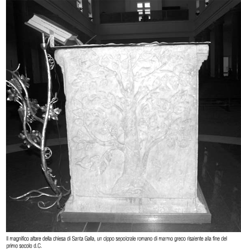 Da dove provenga il cippo funerario romano trasformato in altare non è stato possibile stabilire. Il suo riutilizzo come pietra cristiana rientrava in quel clima di recupero dell’antico che caratterizzò un certo periodo del Medioevo. In particolare, altri cippi più o meno analoghi a quello di Santa Galla e quasi tutti coevi furono adattati ad altari. Il nostro è certamente uno dei più belli tra quanti siano pervenuti fino a noi, quasi tutti conservati nei musei. Si tratta di un parallelepipedo di finissimo marmo bianco di circa un metro di lato, pesante 21 quintali. Non si sa a chi fosse dedicata quell’ara sepolcrale perché l’epigrafe originaria era stata scalpellata e sostituita con la dedicazione gregoriana. Risulta praticamente intatto invece l’ornamento artistico costituito, su tre facciate, da una finissima cornice con motivi vegetali intercalati con figurine animali.