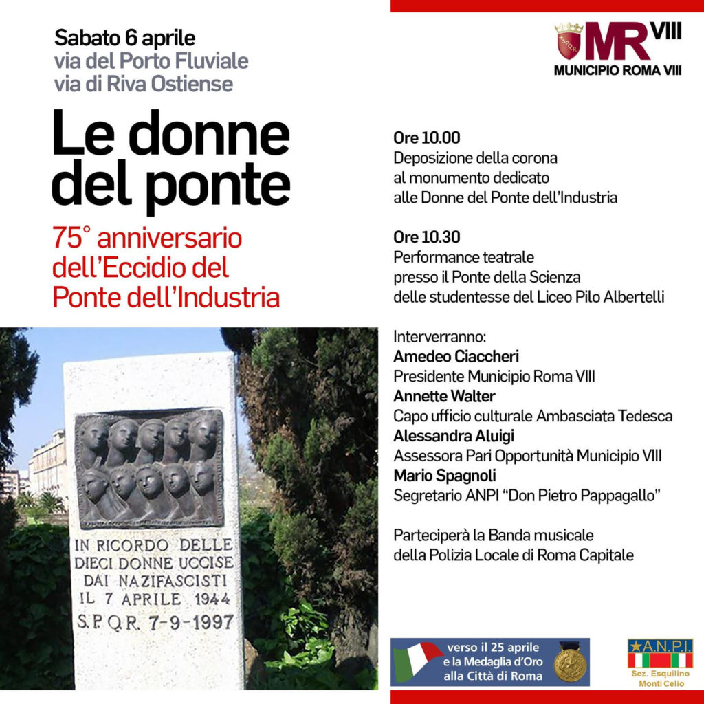 Le donne del ponte – 75 anniversario dell’eccidio del ponte dell’industria Scritto da Redazione il 4 Aprile 2019. Pubblicato in Municipio VIII, Ostiense. Potrebbe interessarti anche:7 Aprile 1944 la tragica storia delle dieci donne…La commemorazione dell'Ottavo Municipio al Ponte…Presentazione del libro "La verità sull'eccidio del…“La verità sull’eccidio del Ponte di Ferro” il libro…Al via l'iter per la ricostruzione del Ponte dell'IndustriaRiaperto il Ponte dell'Industria tra il plauso dei…in fiamme il ponte di ferroUccise dagli occupanti tedeschi il 7 aprile del 1944“Quella strage non è avvenuta”. Alla Casa della…Ponte dell’industria: la riapertura entro dieci giorni Cronaca, le donne del ponte, Storia del quartiere, vita comune e storia locale Precedente Successivo