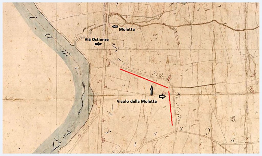 Alla Garbatella c’è una piccola via, in posizione decentrata rispetto ai tradizionali lotti popolari, che ha una rilevanza storica di grande interesse: via della Moletta. Abbiamo ragione di pensare che la zona, quella che diventerà l’odierna Garbatella,in passato era molto probabilmente individuata proprio con questo toponimo: vediamo perché. Attualmente è una traversa che congiunge via Gerolamo Benzoni con piazza Giovanni da Verrazzano, situata nella parte nord del quartiere, a qualche centinaia di metri dal complesso di Eataly. Ma nei primi decenni dell’Ottocento, la strada registrata nella toponomastica dell’epoca come vicolo della Moletta (figura 1) deviava da via Ostiense e si congiungeva con via delle Sette Chiese, l’importante collegamento tra la Basilica di San Paolo e quella di San Sebastiano sull’Appia Antica.