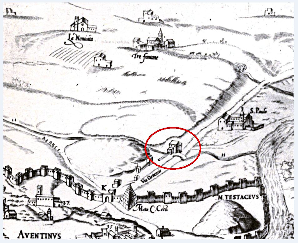 A quei tempi la zona era aperta campagna, con dolci colline e diffuse coltivazioni di vigneti e orti per tutta l’area. E dove oggi si trova l’incrocio tra la via Ostiense e la Circonvallazione omonima ( ponte Settimia Spizzichino), dal lato ex Mercati Generali, si collocava allora l’antica Moletta. Questa, così denominata anche sul registro catastale, era di proprietà del Principe Camillo Borghese(1), ed era l’ultima di una decina di mole e di valche, alimentate dalle acque del fiume Almone, anche detto marrana dell’Acquataccia. (figura 2, figura 3). Le mole erano usate per la macinatura del grano, mentre le valche erano usate per il lavaggio dei tessuti e della lana. Ma da quanto tempo esisteva questo piccolo impianto di molitura? La testimonianza più antica che siamo riusciti a rintracciare risale al 1469, nella mappa di Pietro del Massaio (figura 4), in cui è chiaramente visibile la costruzione sopra il fiume sacro ai romani con alla destra un ponticello; sullo sfondo c’è la Basilica di San Paolo, sulla sinistra si nota la rupe su cui si trova oggi la scuola Principe di Piemonte.