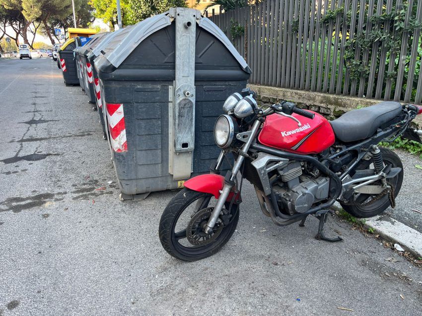 Tuttavia mai si era vista una motocicletta. Anzi, due. Parliamo di due moto Kawasaki entrambe con la targa, abbandonate a ridosso dei cassonetti in via Lorenzo da Pietrasanta nelle adiacenze del Parco caduti del mare alla Garbatella.