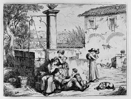 Nel quadro è ben visibile sulla destra la rocca di San Paolo, praticamente immutata dopo più di due secoli. L’edificio posto sul bivio con la graziosa loggetta è l’osteria di Martinetti, oggi scomparsa. La coppia sta passeggiando sulla strada lastricata della via Ostiense; il viottolo che si inerpica tra l’osteria e la rocca è il tratto iniziale di via delle Sette Chiese, che conduceva fino alla basilica di San Sebastiano fuori le mura. Il dipinto riesce a rendere il silenzio naturale che si viveva allora, oggi definitivamente perduto. Ma torniamo alla litografia del Pinelli e osserviamo con attenzione questa vigna fuori porta San Paolo, in aperta campagna, dalla quale emergono diversi spunti di interesse. La famiglia del “vignarolo” utilizzava il grande pozzo centrale per le esigenze dell’orto e domestiche. Sullo sfondo a sinistra si notano, appena abbozzate eppure così caratteristiche, le statue dei dodici Apostoli poste sulla sommità della basilica di San Giovanni in Laterano. Poco a destra è raffigurata la porta San Sebastiano e gli archi dell’Acquedotto Felice.