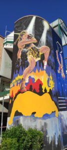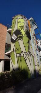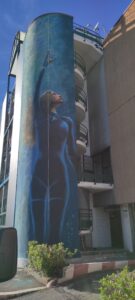 Ognuno ha scelto un tema: Luca Ledda, che abbiamo trovato intento a dare gli ultimi ritocchi alla sua opera, ha scelto la donna e lo yoga. “Il soggetto – come spiega nel suo cartellone di presentazione – è un omaggio a Jessamyn Stanley, famosa insegnante americana di yoga nota per le sue forme abbondanti che vanno contro tutti gli stereotipi e canoni di bellezza odierni. Il dipinto ha come obiettivo non solo quello di promuovere lo sport e i suoi benefici ma anche quello di essere un monito contro la propaganda estetica promossa dai social network ed i media odierni che ci vogliono fisicamente “perfetti” e performanti.”