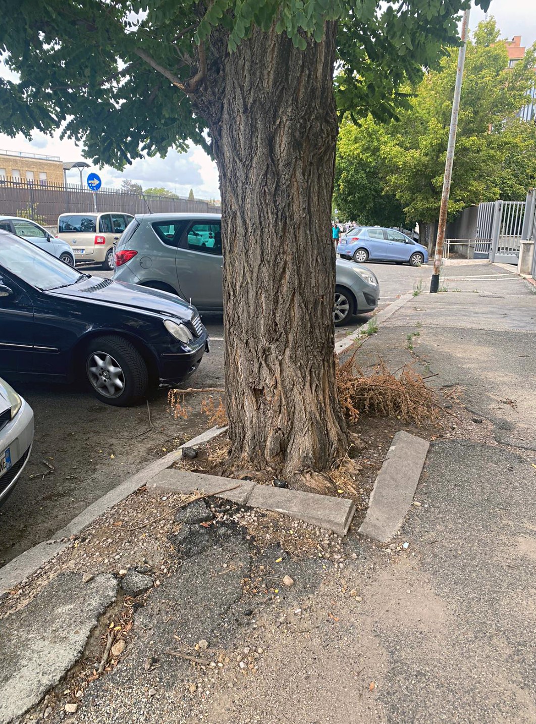 Marciapiedi sconnessi e ostruiti da rami caduti. Così si presenta via Vito Volterra nel quartiere San Paolo. A colpire l’attenzione è una porzione di strada transennata all’altezza del civico 37, in corrispondenza di tre alberi le cui fronde hanno in parte invaso il cortile della facoltà di Scienze dell’università Roma Tre. “A inizio settembre è caduto un grande ramo” ha raccontato una residente, “e la strada era piena di rami e foglie secche, anche i parcheggi erano praticamente inutilizzabili”. A liberare il passaggio è stato un privato – parola che torna spesso nei racconti dei cittadini. Sono sempre loro quelli che, armati di pompe e buona volontà, innaffiano i tredici alberelli piantati di recente su un altro tratto della via. “Le piante sono state sostituite solo in parte” ha proseguito la residente.