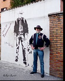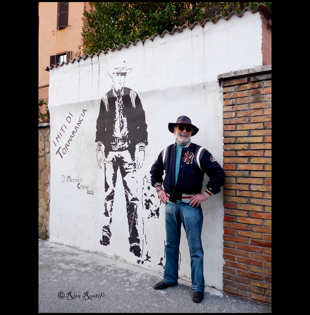 Quinto Gambi in posa davanti al murale della De Merode Crew in via Valeria Rufina, foto di Rita Restifo, 2013