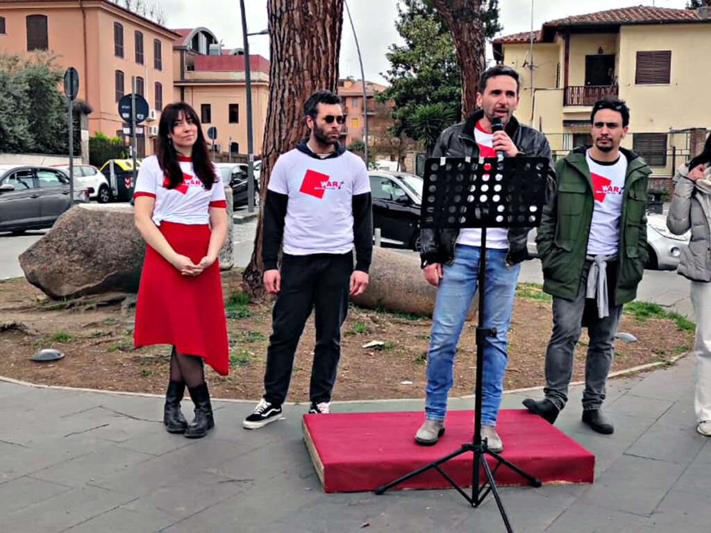 “L’idea è nata da me e da altri artisti” – ci dice Marco Neri, documentarista della scuola d’arte cinematografica Gian Maria Volonté – “Con un gruppo di scenografi, filmaker, artisti del cinema, attivisti, abbiamo deciso di scendere in piazza con una ape rossa e leggere brani contro tutte le guerre. Hanno aderito Simone Liberati, Giulia Galassi, Gabriel Montesi e Laura Antonini.”