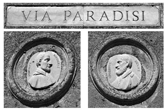 Si è detto che quell’appellativo fosse passato alla strada dal nome di qualche ricca famiglia proprietaria nella zona: ma di tale proprietà non s’è trovato alcun riscontro. Del resto, nella cartografia antica il toponimo “Via Paradisi” non appare mai. Noi pensiamo invece che quella targa classicheggiante risalga agli inizi del 1800, quando il Valadier pose mano a quella chiesetta per conto di Nicolò Maria Nicolai, il facoltoso monsignore che aveva acquistato buona parte dei terreni circostanti.