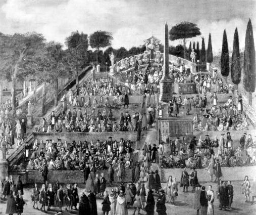 Nel vasto prato antistante, scrupolosamente diviso in “quartieri” separati da incannucciate, si accampava il popolo per consumare sull’erba una “refezione”, costituita da un pane, uova sode, fette di salame, cacio, qualche frutto e vino annacquato. Al centro del prato si innalzava un obelisco egizio tuttora esistente.