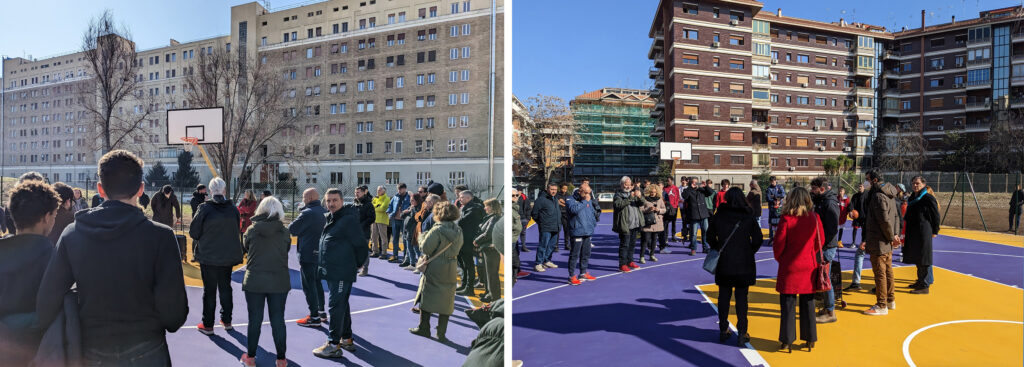 Il secondo taglio di nastro si è tenuto in via Malfante, dietro Piazza Navigatori. Dove c’era un canneto infestante oggi c’è un colorato campo da basket con decine di giovani scalpitanti che tentano di centrare un canestro.