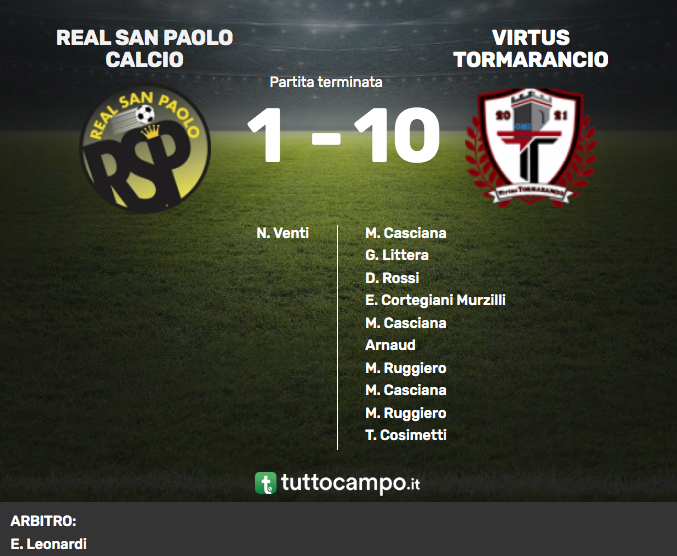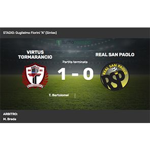 La partita è molto equilibrata, le squadre sono messe bene in campo. La Virtus pressa alto l’avversario e lo chiude nella propria metà campo, il San Paolo tenta le ripartenze in contropiede ma pecca di precisione nell’ultimo passaggio. Al 19’ il Tormarancio passa in vantaggio, il numero 6 Cristian Monteiro scatta sulla fascia sinistra palla al piede e serve centralmente in area il numero 8 Tormmaso Bartolmei, che si libera di un difensore e lascia partire un tiro deciso, il portiere del San Paolo respinge sullo stesso Bartolmei che ribadisce in rete di destro per l’1-0.